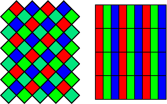 Current displays use vertical RGB stripes. This is quite wasteful, especially considering how the human eye works. The human eye produces a sharp image only for greenish colors, red and blue are blurred. The eye therefore already spends 2/3 of the sensors in the fovea to green. Camera makers know how to use this, and came up with the Bayer pattern. There, half the sensors are green, the rest red and blue. Therefore, my suggestion is to use a Bayer pattern for the colors (rotated by 45°, to have maximum resolution on green in horizontal and vertical direction):