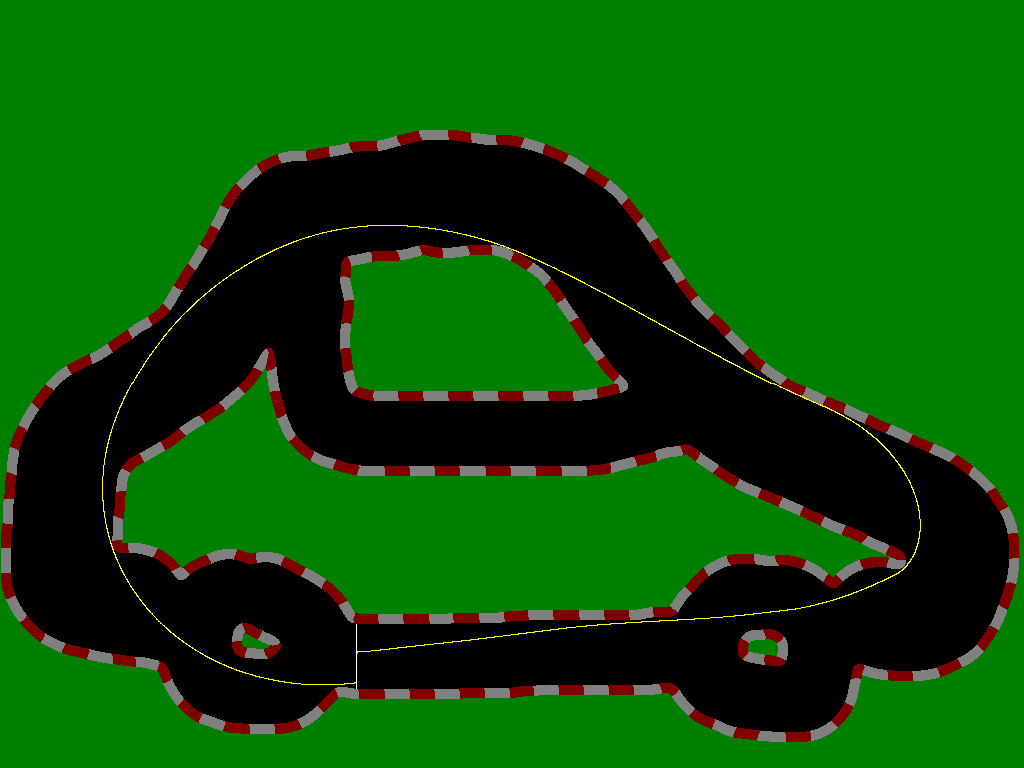For the visualization, I choose [html]MINOS, my GUI extension to Forth. It provides a turtle graphics, which is the only widget I need in this case. I use only a very limited subset of this turtle graphics: paint an icon at (0,0), and draw x,y paths. The obvious color for the car was yellow (don't know why it is so obvious, but a lot of other teams decided to use the same color ;-), and red after it crashed (it never should paint red, but you can't know...).