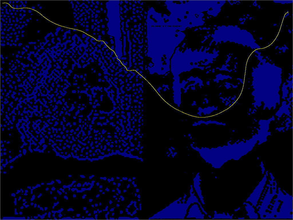 The next task is the internal representation of the track: I choose a simple 2D array with three values: 0 for road, 2 for goal, 1 for the rest. A second array then is computed that contains nearly-euclidean distance to the goal (starting from the left side of the goal, with the goal itself being impassable). I use the same flood-fill approach I used in last year's contest for the robot, modified to pseudo-eclidean coordinates (diagonals are weighted sqrt(2), and there are three arrays for updating; this flood fills the field with an octagonal growing rule).